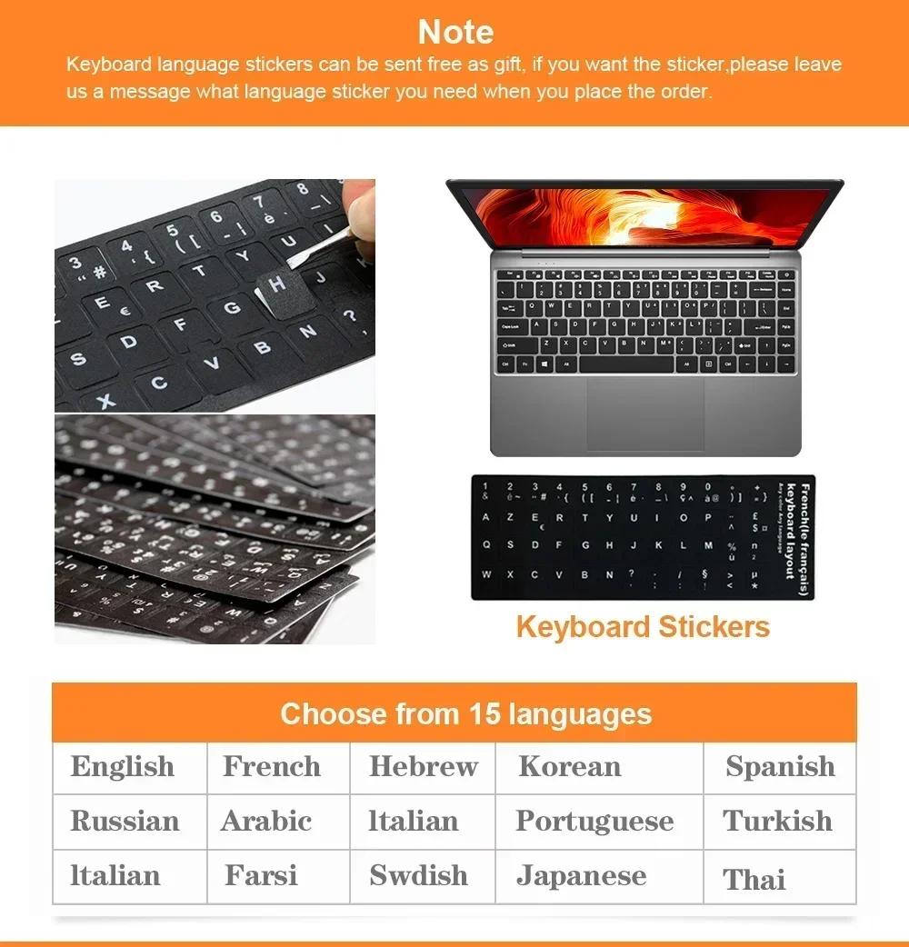 — Our keyboard is QWERTY English standard version, but we will send keyboard stickers of other languages below as a gift. If you need it, just leave us a message. Keyboard stickers: Russian, Spanish, French, German, Italian, Hebrew, Arabic, Turkish, Thai, Japanese, Korean.