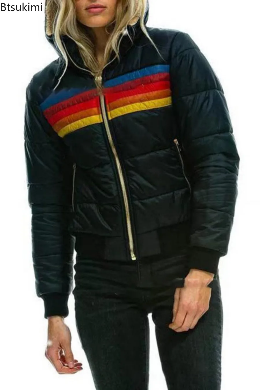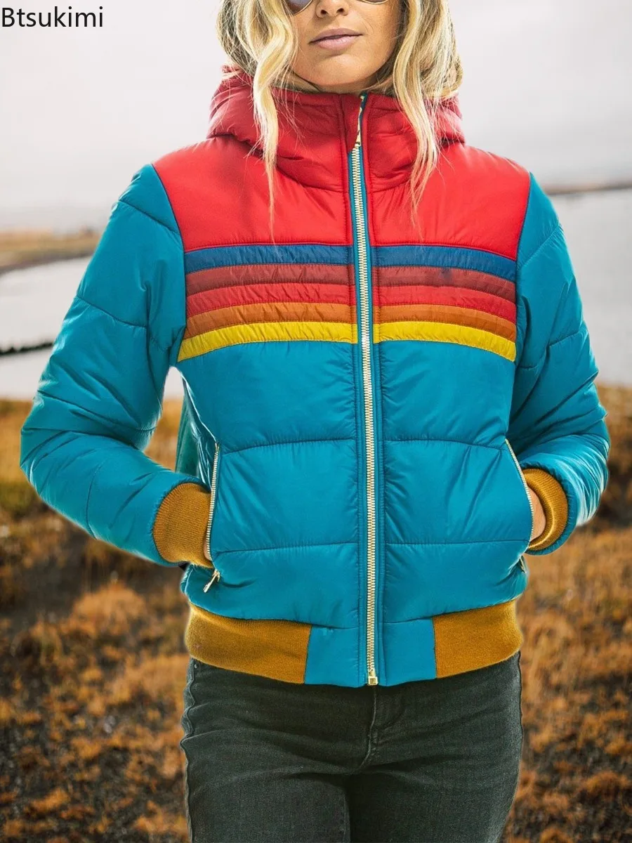 2025 Autumn Winter New Fashion Stripe Zipper Hooded Parkas Women Cotton Clothes Rainbow Jacket Splicing Pocket Ladies Outerwear