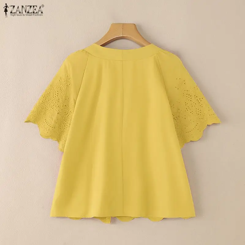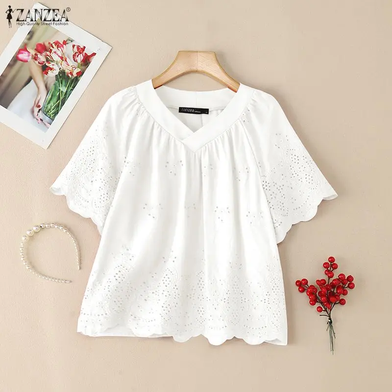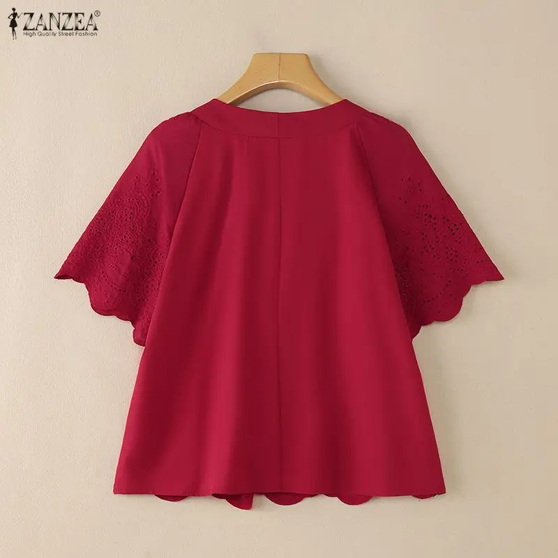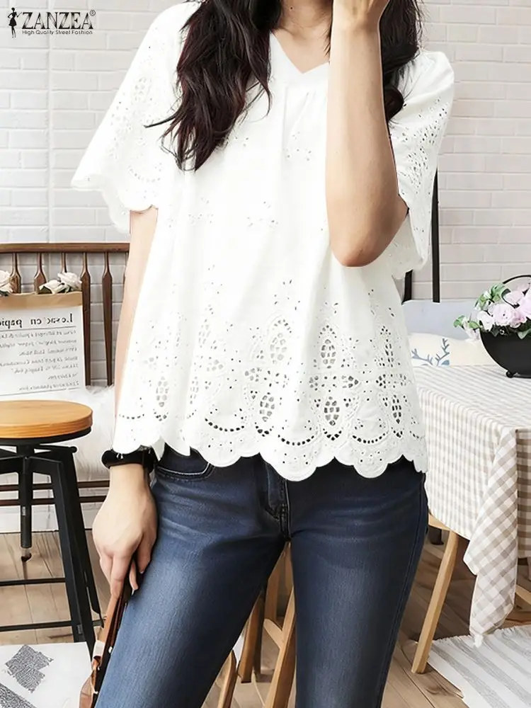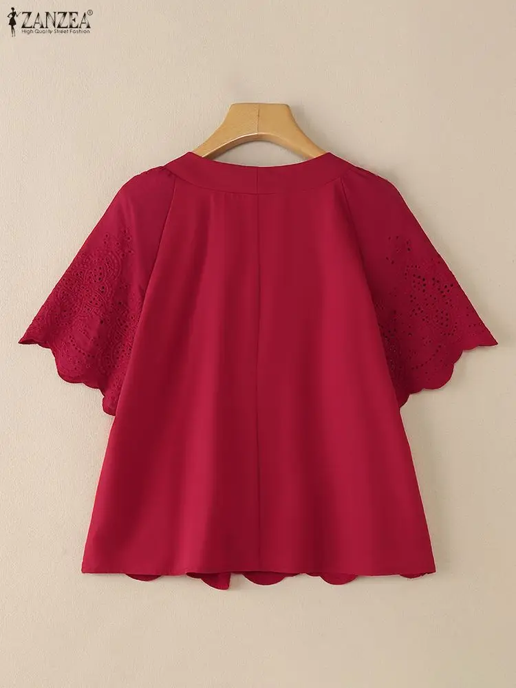 2025 ZANZEA Summer Lace Crochet Shirt Women Blouse Trend 2025 Elegant V Neck Work Tops Tunic Femme Short Sleeve Patchwork Blusas