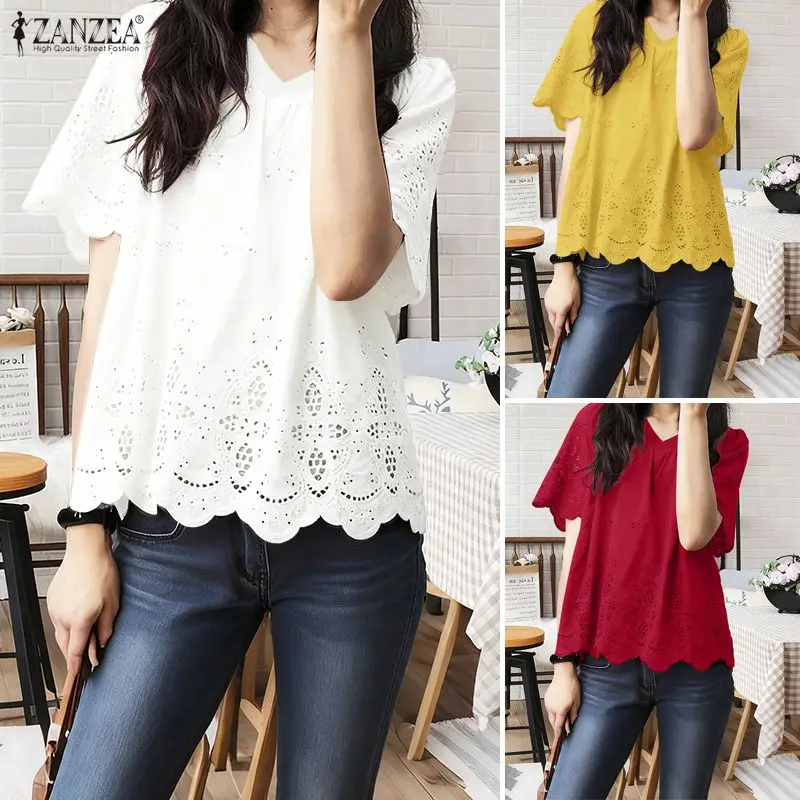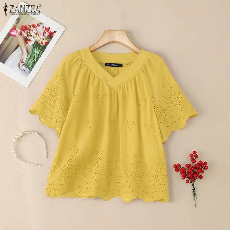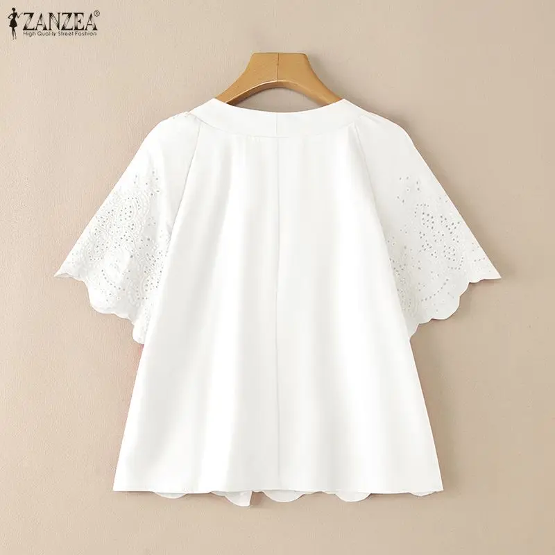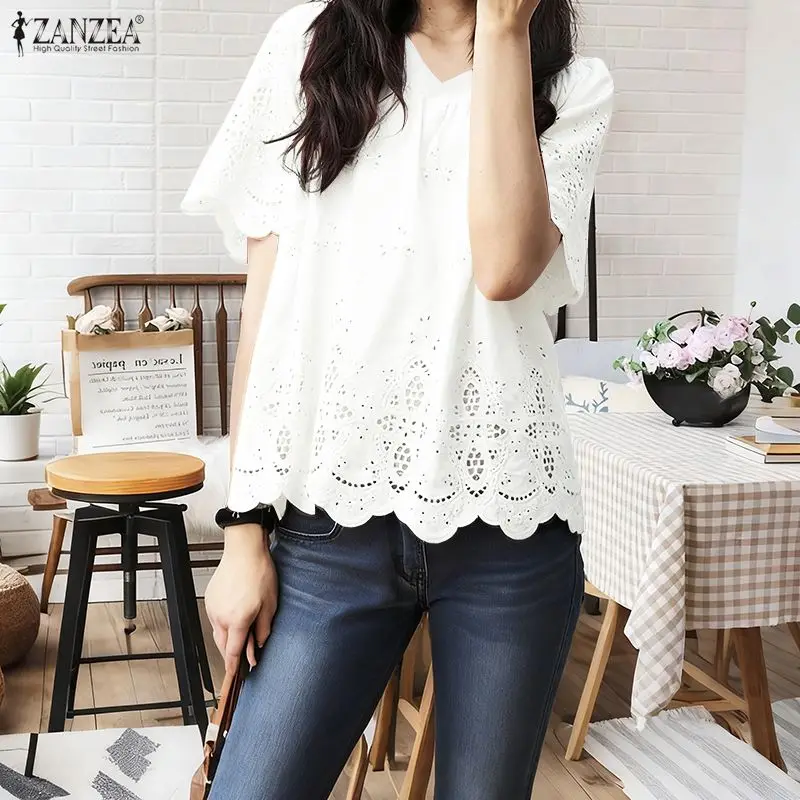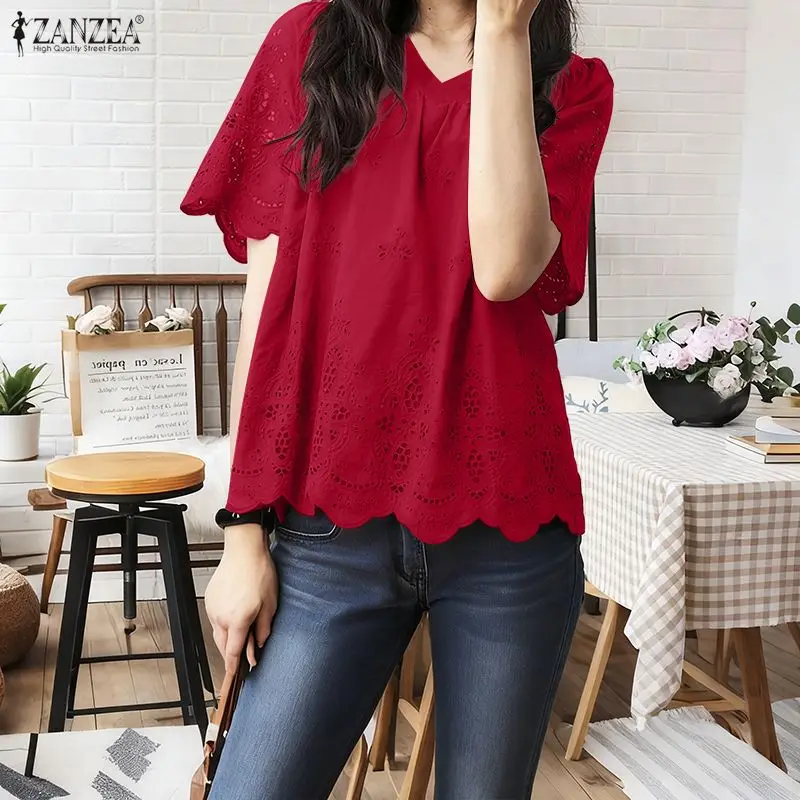 2025 ZANZEA Summer Lace Crochet Shirt Women Blouse Trend 2025 Elegant V Neck Work Tops Tunic Femme Short Sleeve Patchwork Blusas
