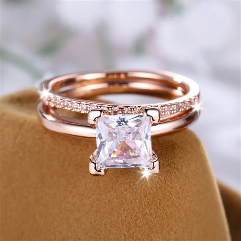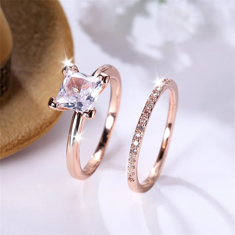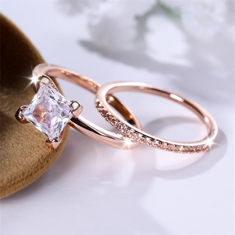 2pcs Classic Square Bridal Sets Promise Engagement Rings For Women Rose Gold Color White Zircon Wedding Ring Set Party Jewelry