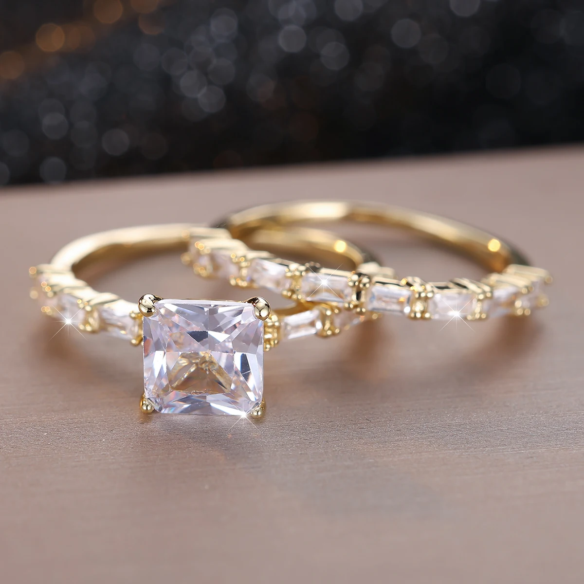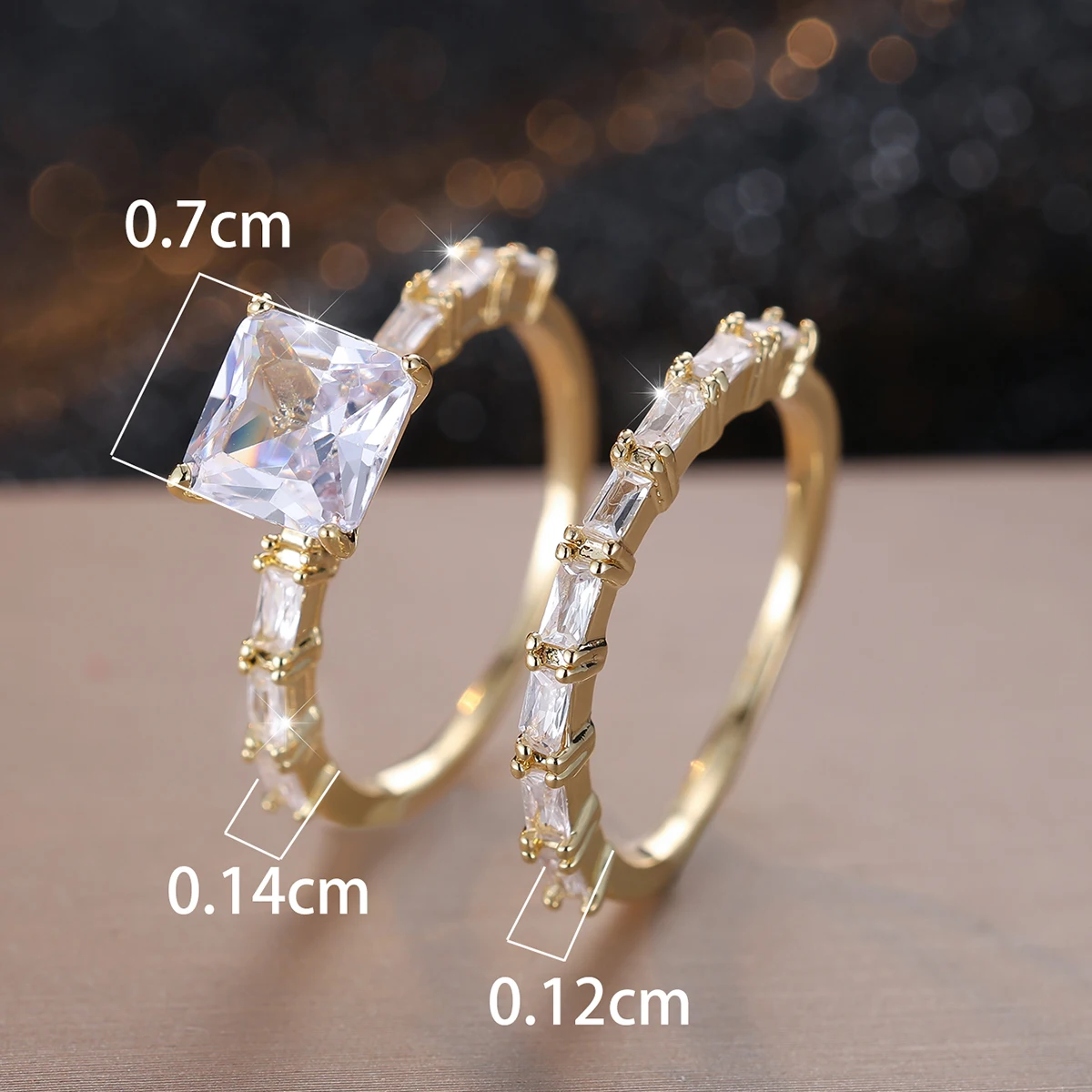 2pcs Female Luxury Stacking Square Engagement Ring Sets For Women Gold Color White Zircon Bridal Wedding Bands Mothers Day Gifts