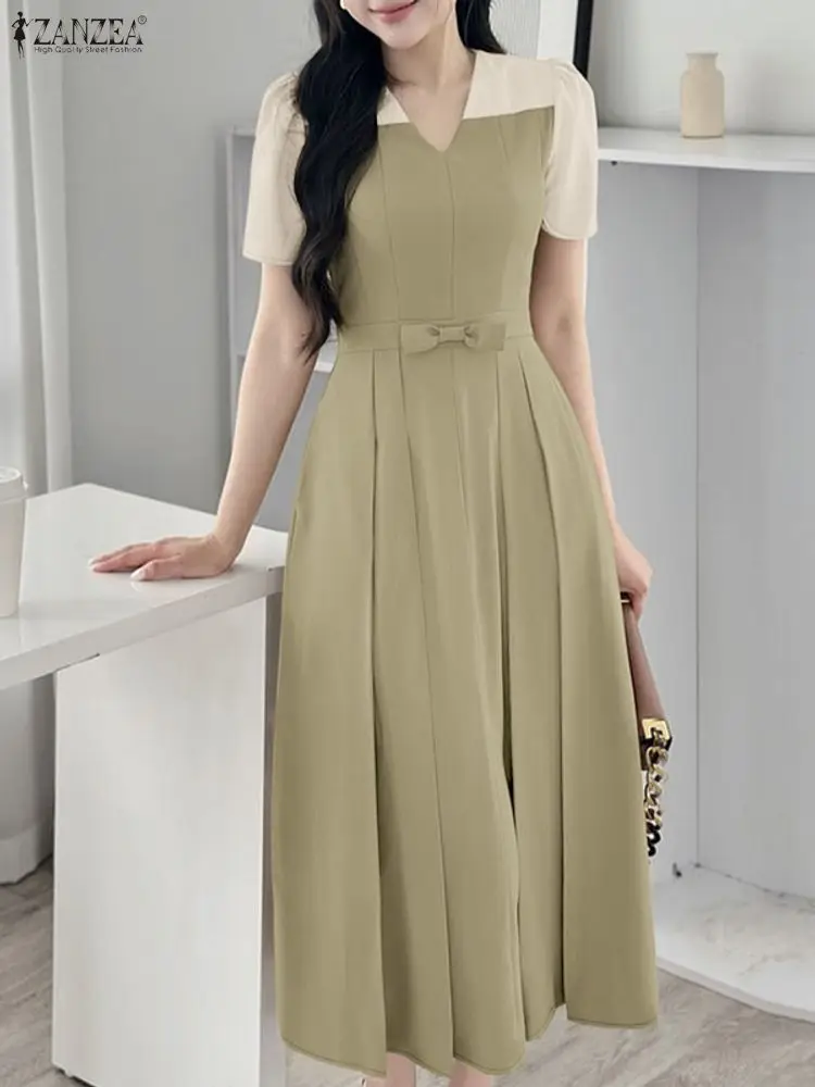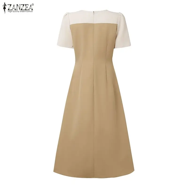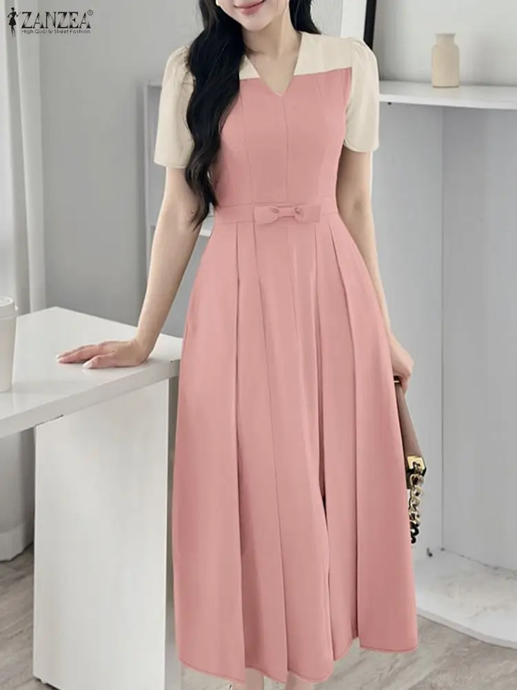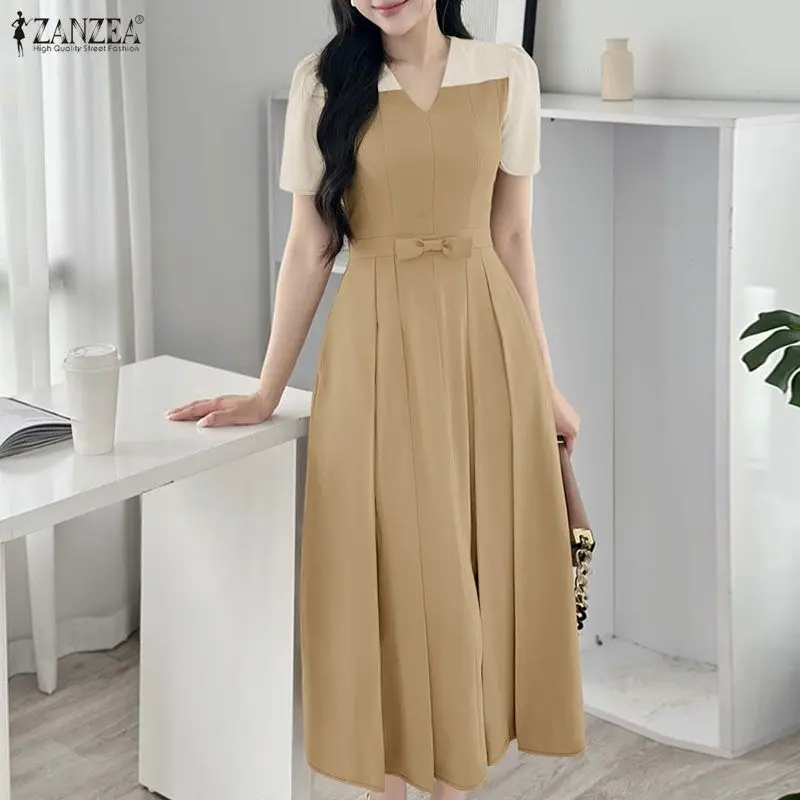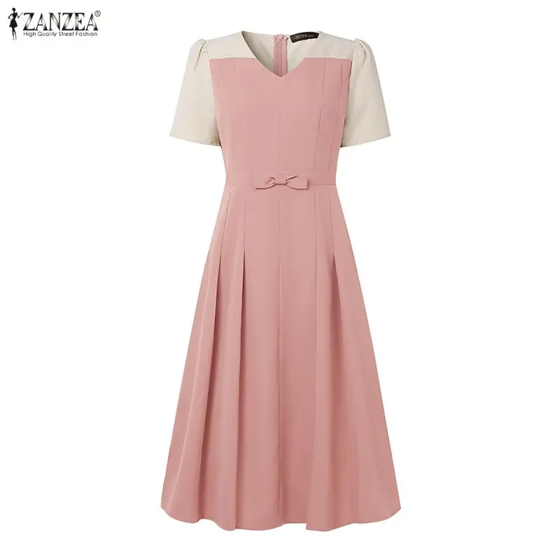 Elegant Women Midi Dresses 2025 ZANZEA Summer Dress Stylish V Neck Party Dress Short Sleeve Patchwork Work Sundress Pleated Robe