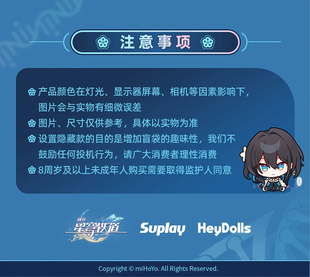 1. Blind box toys are not works of art. Slight scratches and other defects during the production process are not quality problems. Returns or exchanges are not supported.
