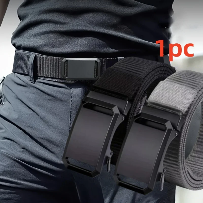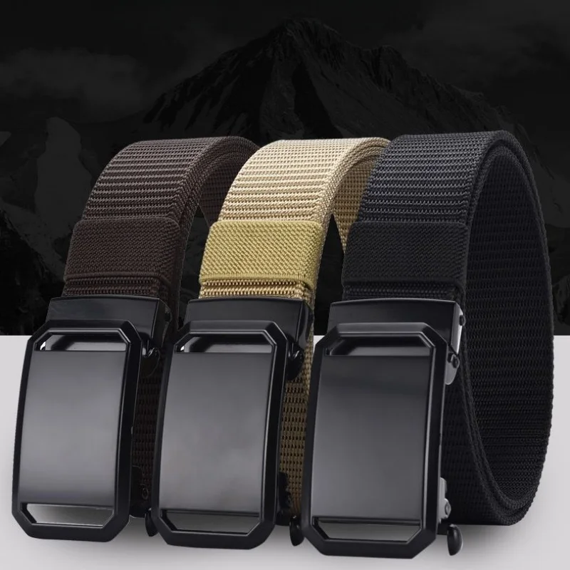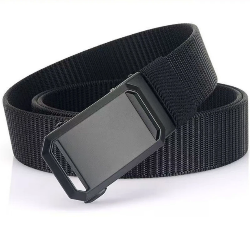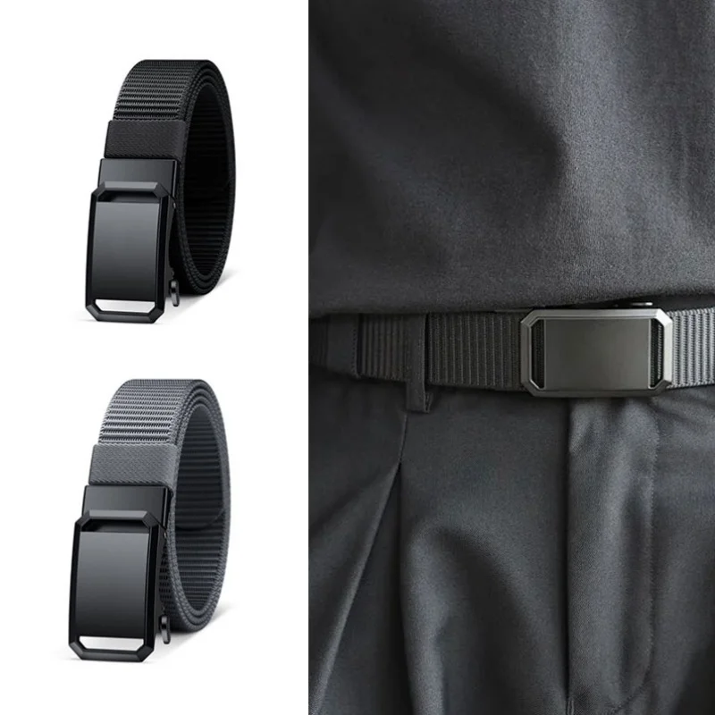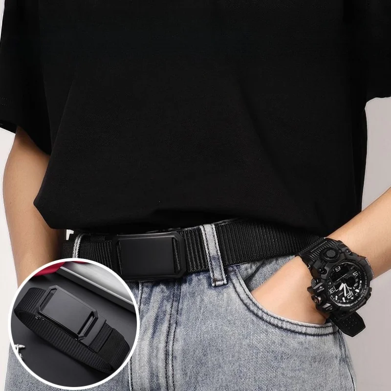 Men’s casual nylon automatic buckle belt – black, durable fabric with square iron buckle ring, simple design suitable for daily