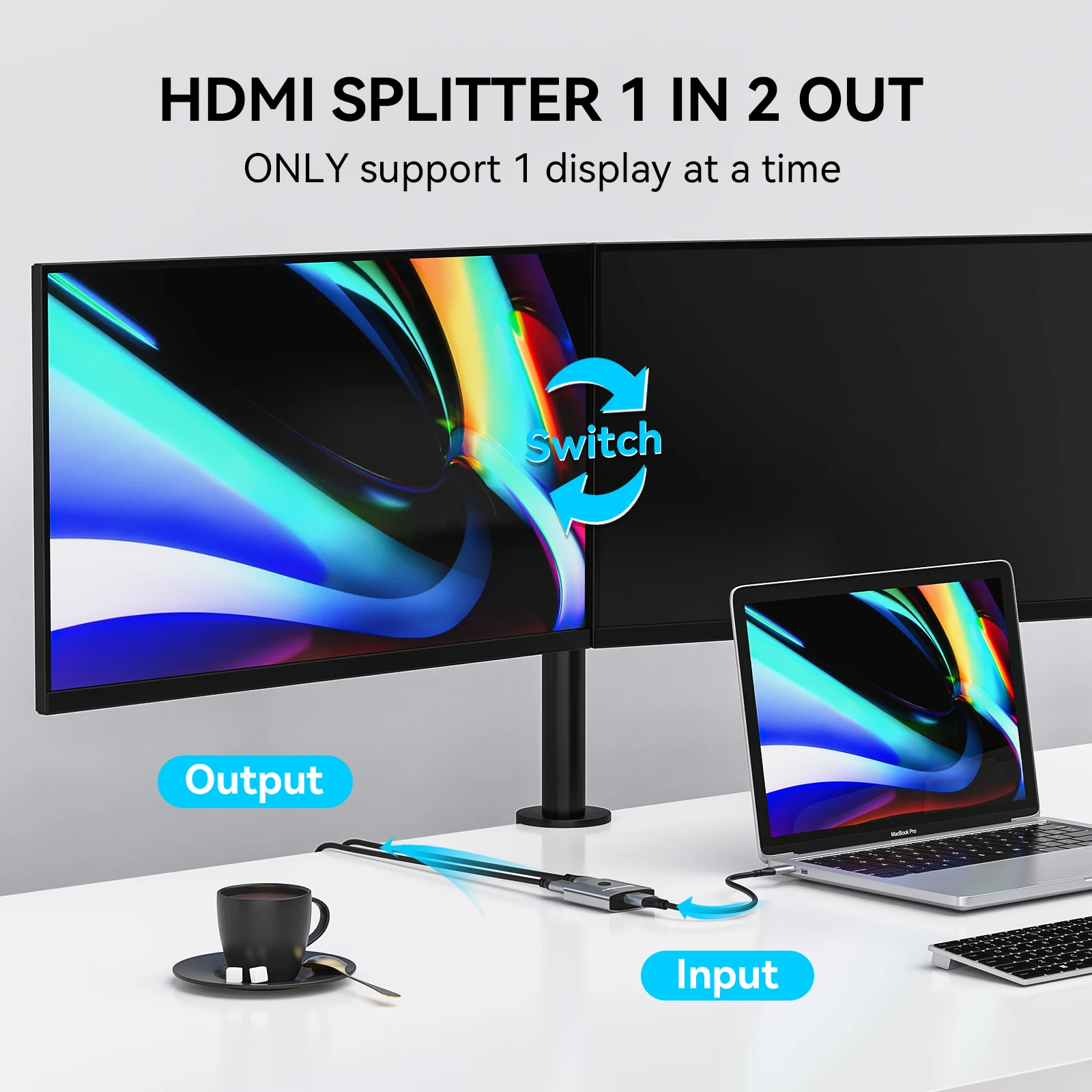 【Wide Compatibility】: This 2 in 1 HDMI splitter supports most HDMI devices with standard HDMI interface. Input: Computer, XBox, PS5/PS4, Blu-Ray DVD Player, Route Roku, Chromecast, PC, etc. Output: HD-Ready, Full HD TV, TV, Monitors, Projectors.