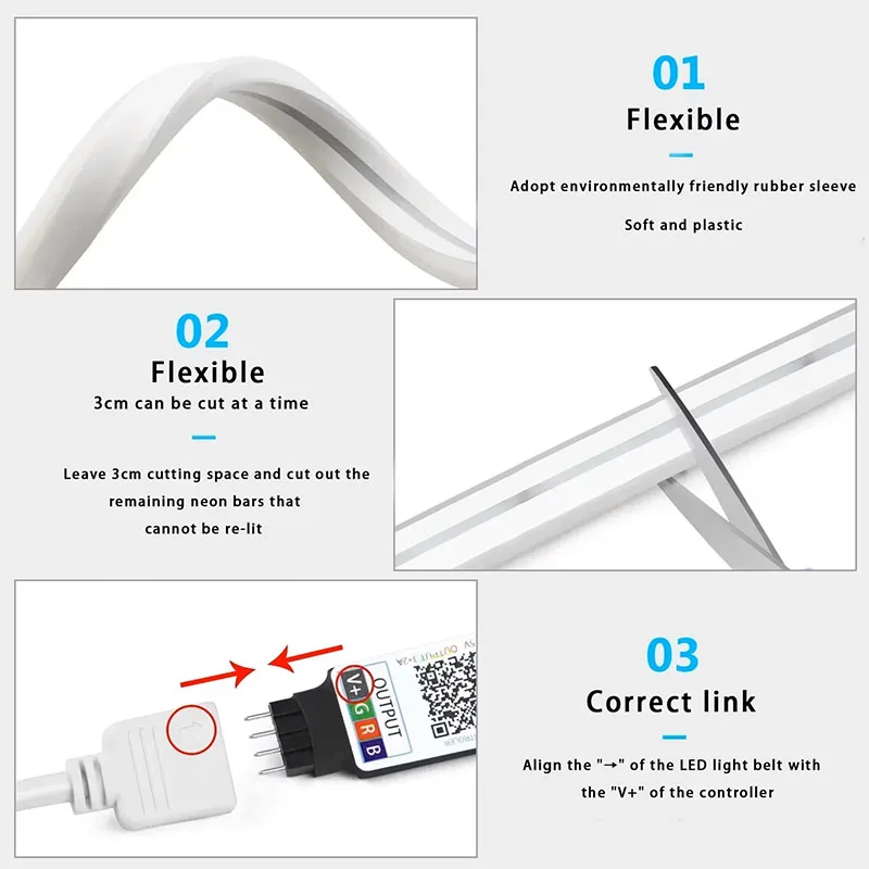 Attention: The correct connection method between the neon LED strip and the controller, The “→” mark of the neon LED strip needs to be aligned with the “V+” mark of the controller