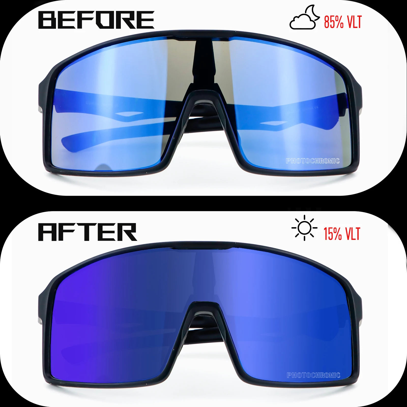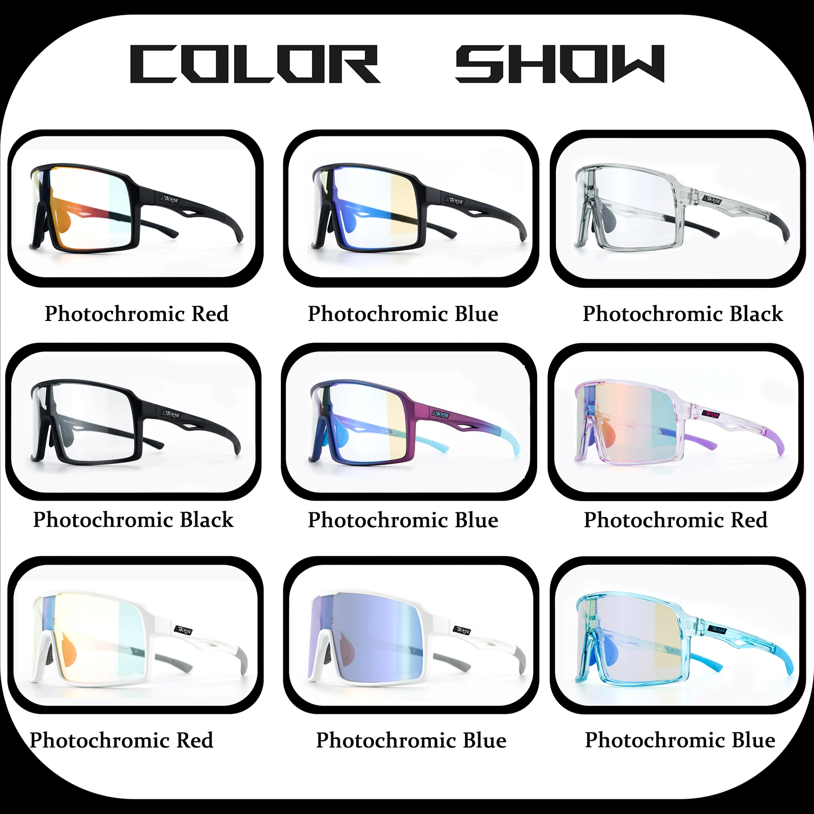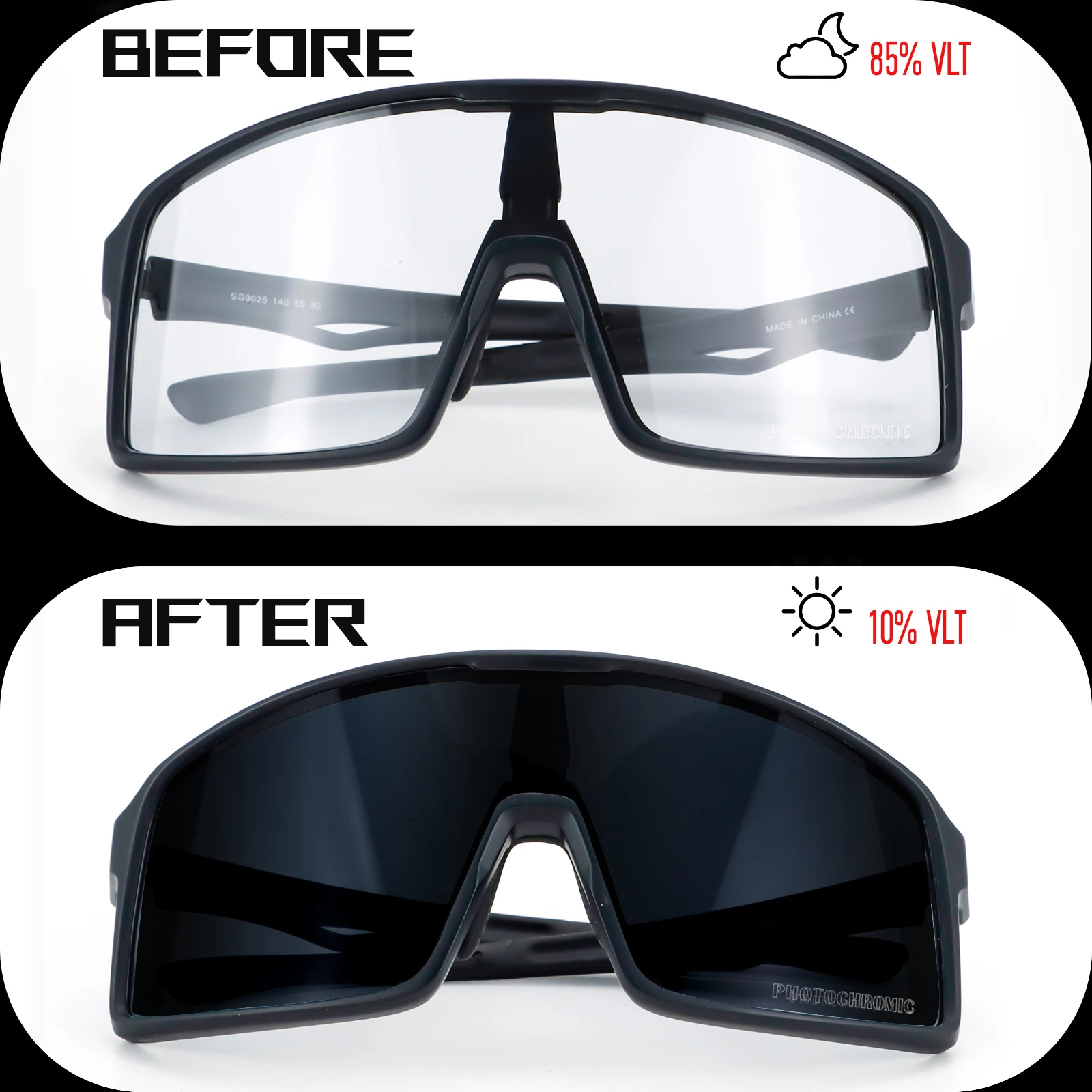 2. 【Lens Technology】Photochromic sunglasses: polycarbonate lens, the lens will change with the intensity of ultraviolet light, the stronger the ultraviolet light, the darker the lens color. Once inside the room, the lens will return to a transparent