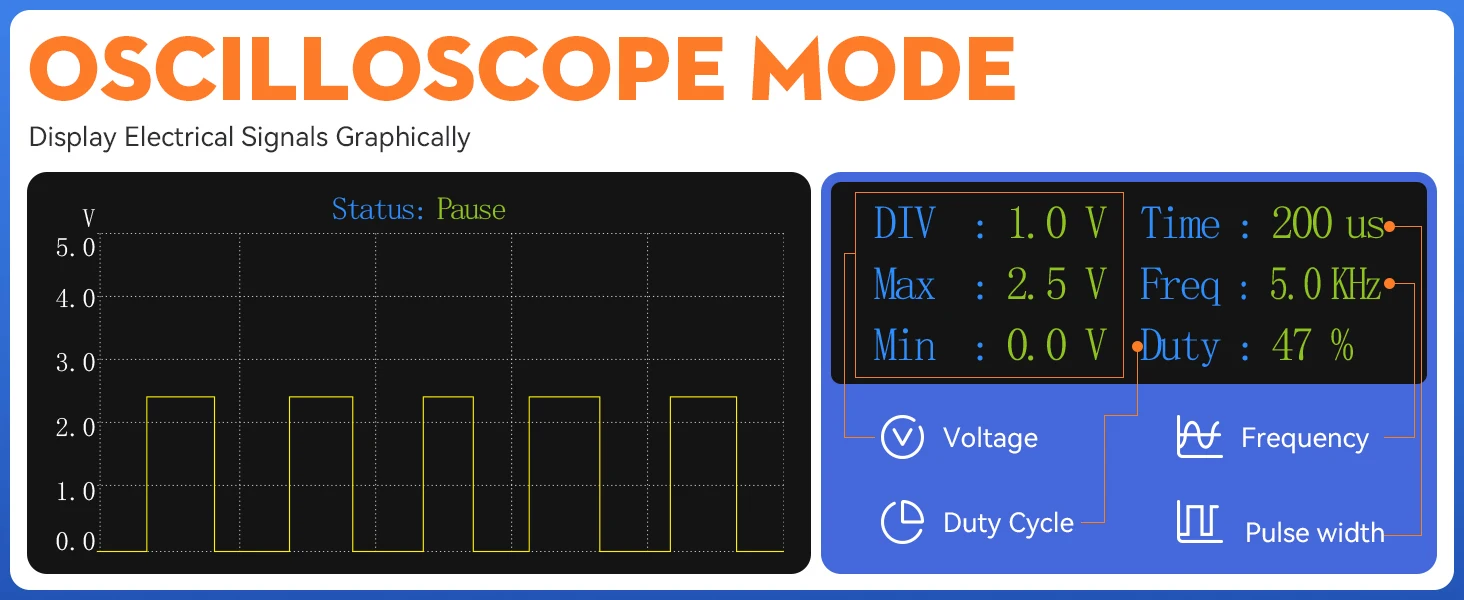 For complex circuit problems, it is difficult to understand the dynamic changes of signals by relying on digital readings alone. The oscilloscope mode visually displays the morphological changes of the signal by visualizing the signal, allowing customers to quickly identify abnormal behaviors in the circuit, such as waveform distortion, signal attenuation and other issues.