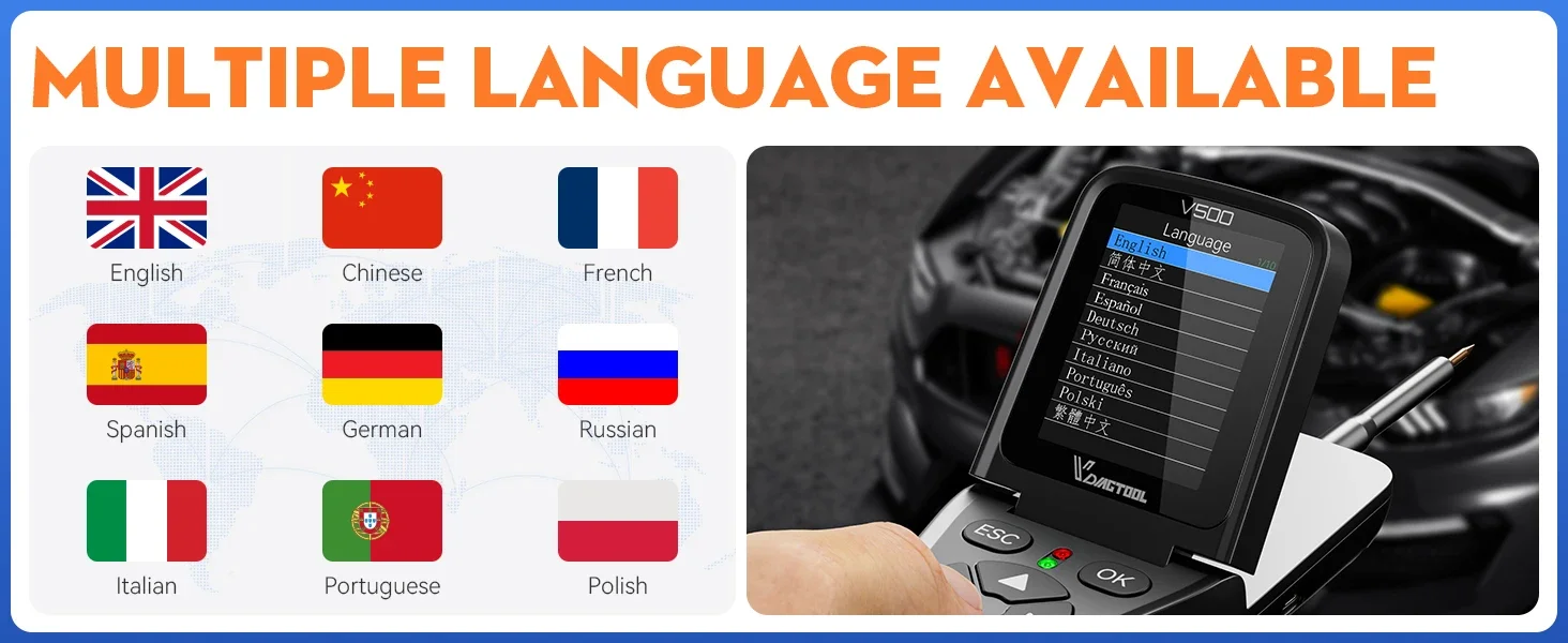 VDIGATOOL V500 supports 9 languages including ✔English, ✔Chinese, ✔French, ✔Spanish, ✔German, ✔Russian, ✔Italian, ✔Portuguese,✔ Polish, etc., which can effectively help customers overcome language barriers.