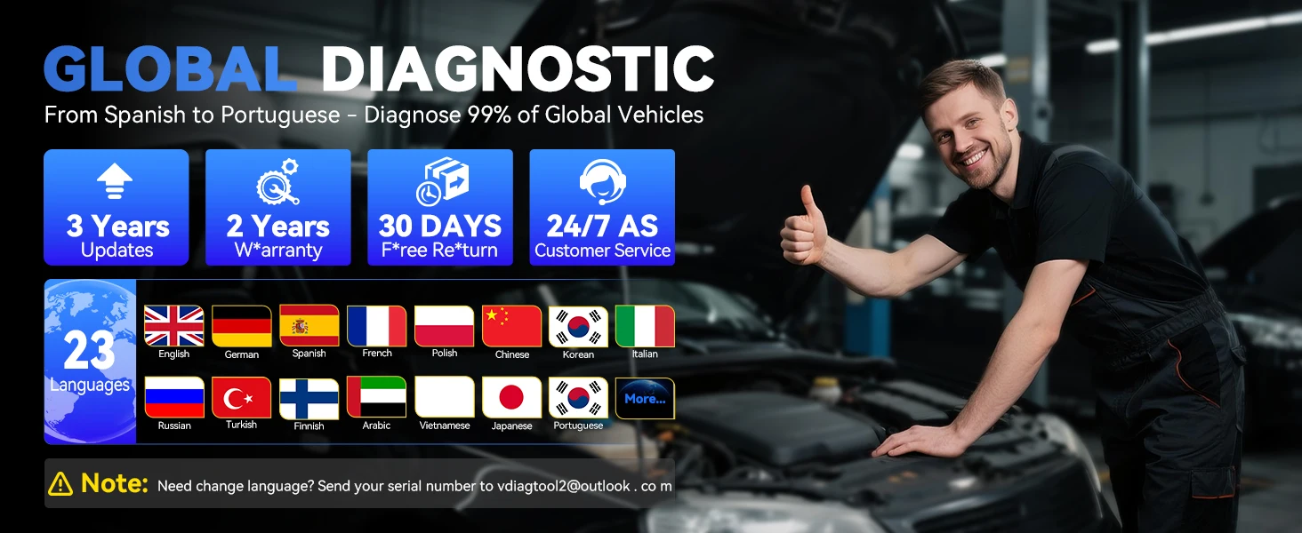 3.VDIAGTOOL Provides 24-hour Online Service and Professional Technical Support.For example,if you want to change the language, you just need to send us the SN(on the back of the device),and then we will authorize the language to you within 24 hours!