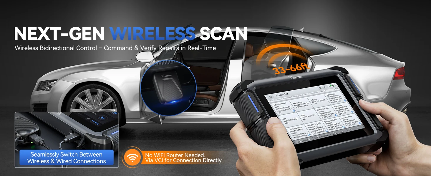 VD70S bidirectional scanner uses Wi-Fi which is 20 x faster than traditional Bluetooth models, transmits at speeds up to 64 Mbps (maximum), and offers coverage up to 66 feet, helping you say goodbye to 2-metre cable restrictions and effortlessly perform bidirectional testing.