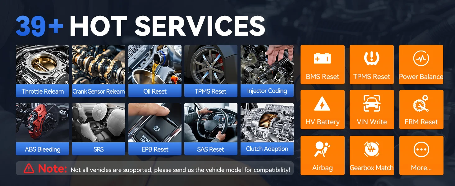 Include: ABS System, Engine System, SAS System, TPMS System, IMMO System, Battery System, Oil Service System, SRS System, DPF System, Air Conditioning System, Transmission System, etc…