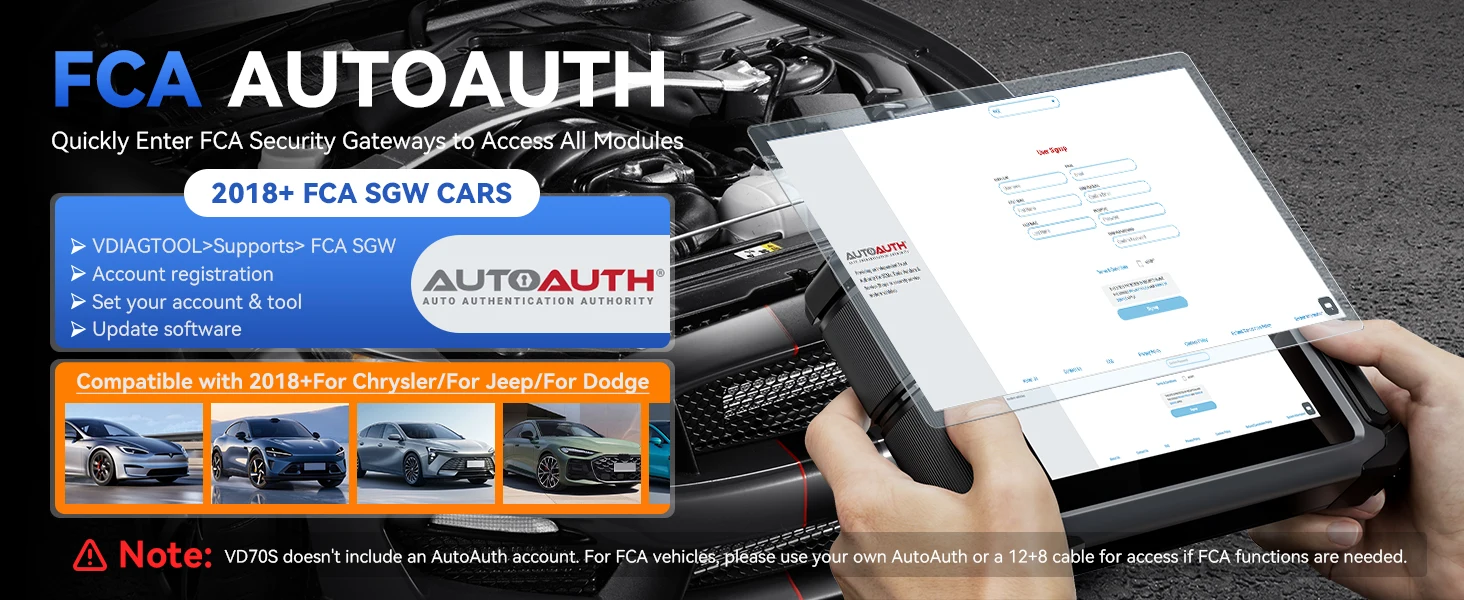 For 2018+ FCA models equipped with a security gateway module, such as Fiat, Chrysler, Dodge, and Alfa Romeo vehicles, VDIAGTOOL VD70S automotive diagnostic scanner facilitates functions including clearing fault codes, ECU coding, performing bidirectional active testing, and resetting learn cycles