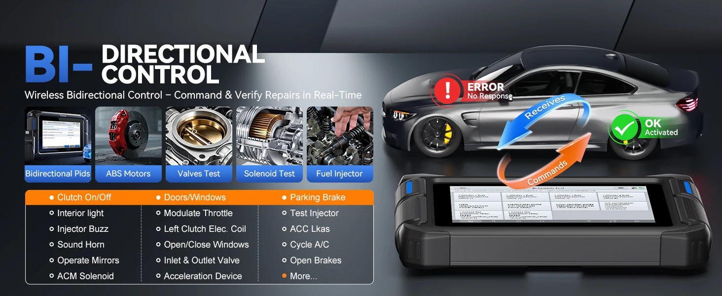 VDIAGTOOL VD70S Bluetooth bi-directional automotive scanner has the ability to perform bidirectional control. Active test refers to the scanner directly outputting commands to the ECU to perform individual tests, checking the working status of individual actuators, and quickly identifying problematic parts without disassembling the vehicle. It can be used with most ECUs, including windows, doors, wipers, headlights, taillights, actuators, pumps, valves, and more. It can perform compression tests, door lock tests, horn tests, and more, helping you quickly pinpoint the exact cause of vehicle malfunctions, saving diagnostic time!