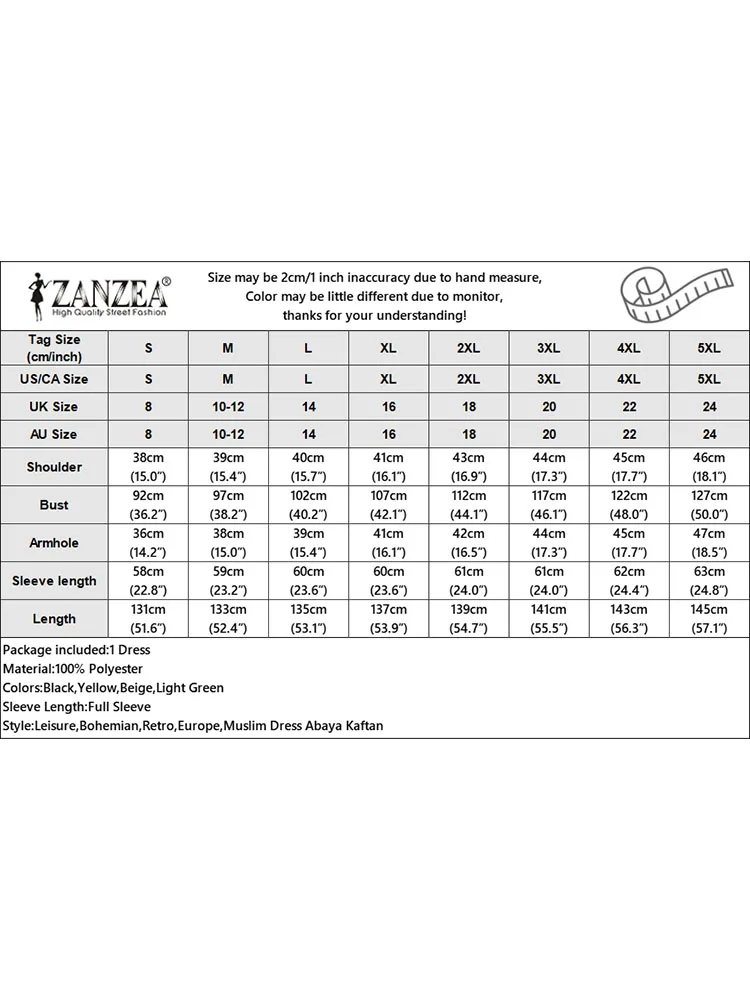 | Package included:1 Dress Material:100% Polyester Colors:Black,Yellow,Beige,Light Green Sleeve Length:Full Sleeve Neckline:O-Neck Pattern:Grid Patchwork Length:Ankle Length Thickness:Thin Style:Leisure,Bohemian,Retro,Europe,Muslim Dress Abaya Kaftan Season:Spring,Summer,Autumn,Winter Occasion:Family,Party,Beach,Wedding,Holiday Label: Yes Attentions: 1.The Real Object May Exist Slightly Colors Differences Compared To Images As Different Computers Display.Caution If Minding,Thanks. 2.There Might Be A Manual Measuring 1-3 cm Error.Sorry For Any Inconvenience. 3.Please Prevail On Real Item, Model Images For Reference Only. 4.Attention!!!Please check the size chart carefully before placing the order.