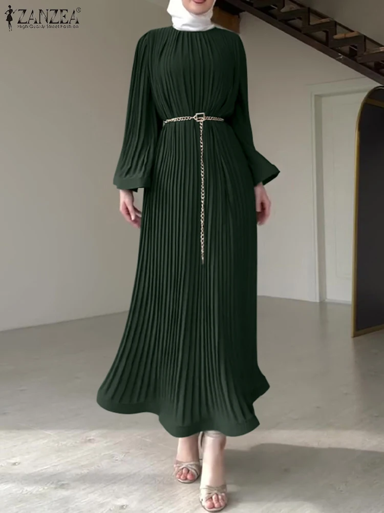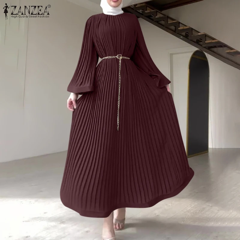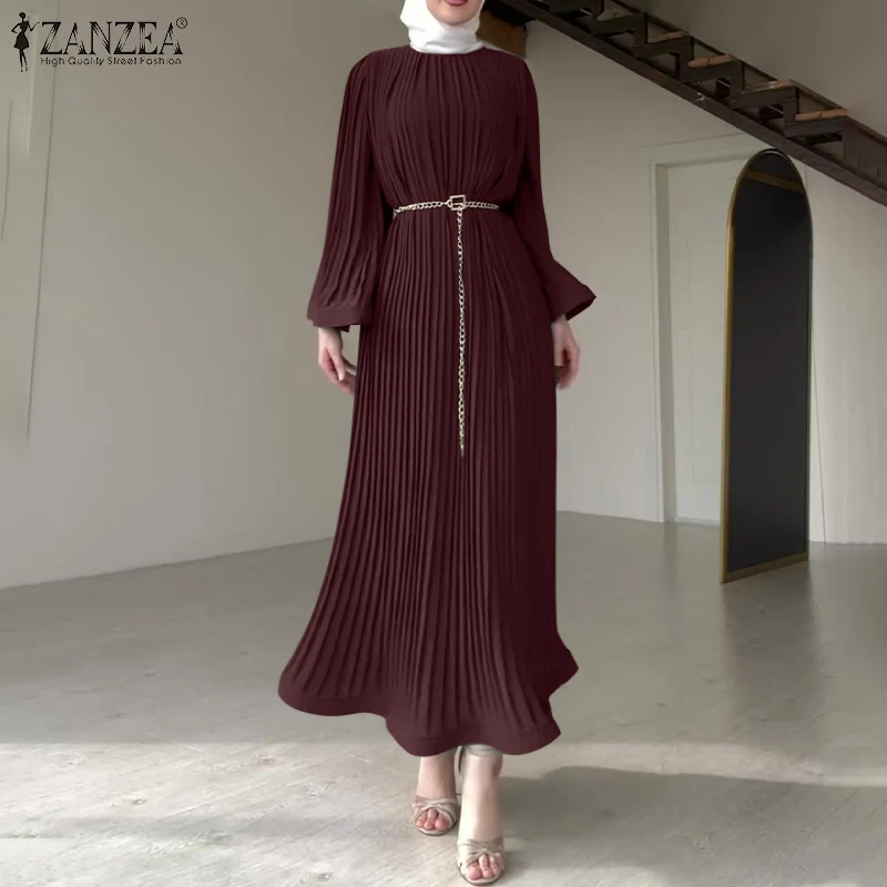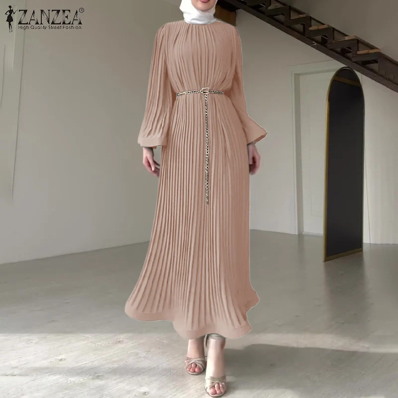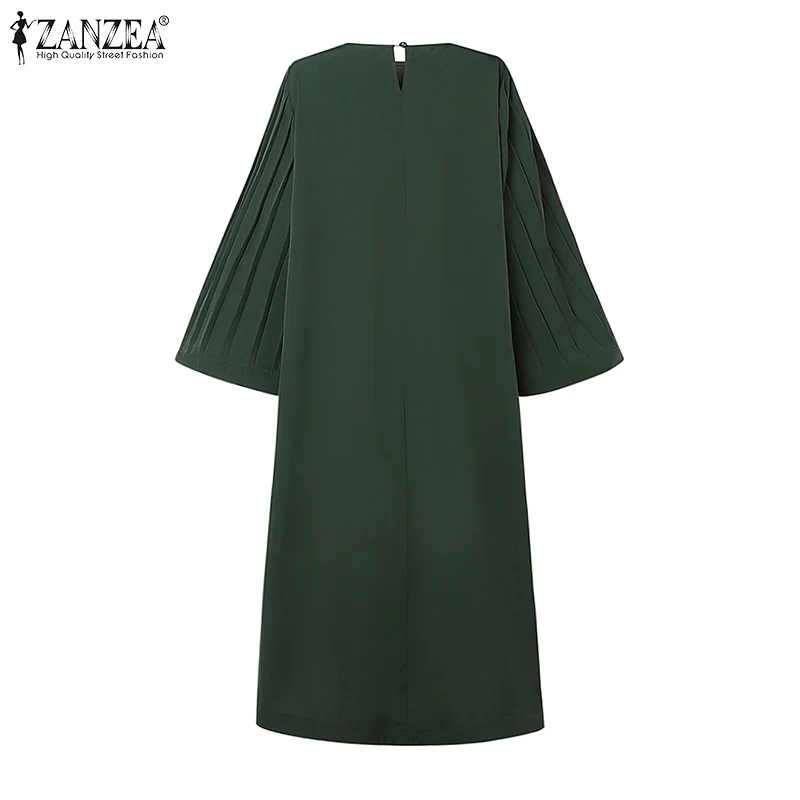 ZANZEA Spring Women Long Sleeve Pleated Dresses Vintage Solid Muslim Abaya Dress Elegant Casual Loose Sundress Islamic Clothing